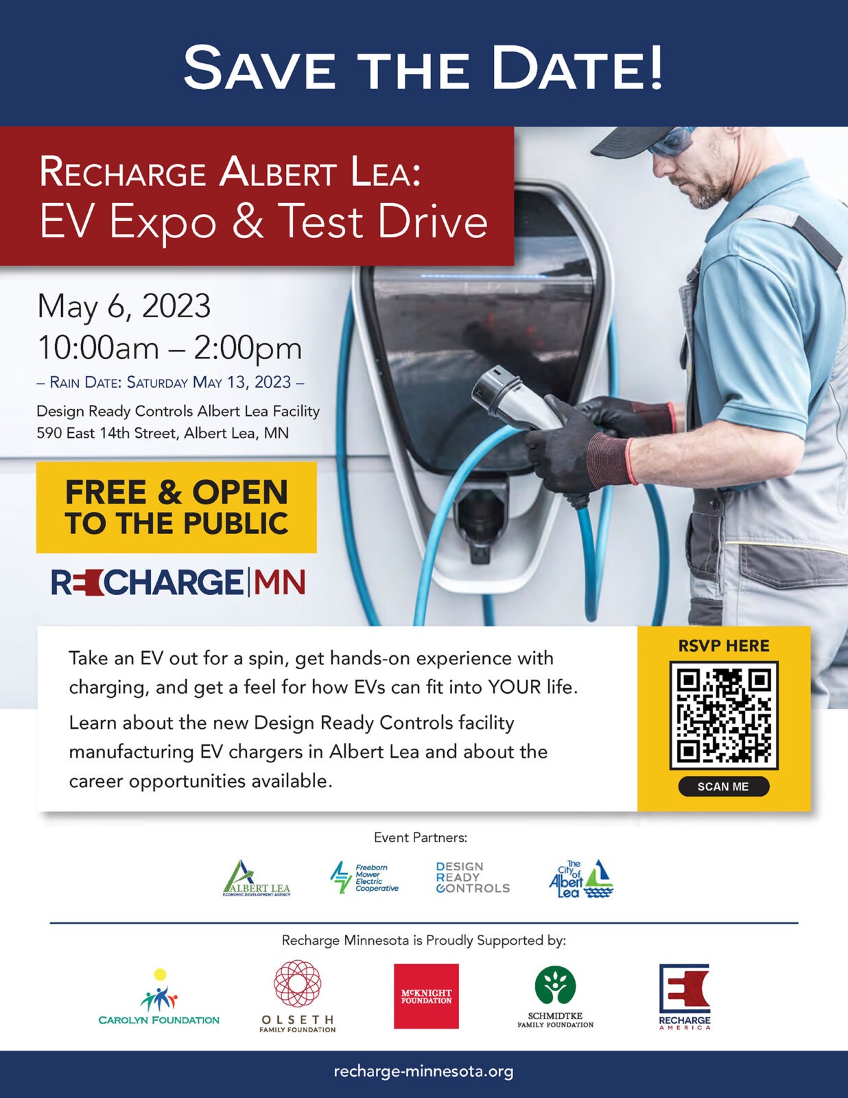 At the Recharge Albert Lea EV Expo and Test Drive, you can take an EV out for a spin, get hands-on experience with charging, and get a feel for how EVs can fit into YOUR life. Learn about the new Design Ready Controls facility manufacturing EV chargers in Albert Lea and career opportunities available. Thank […]